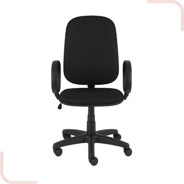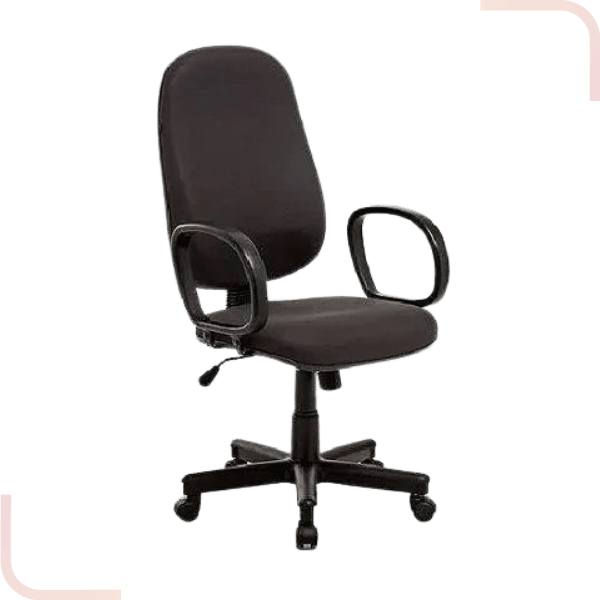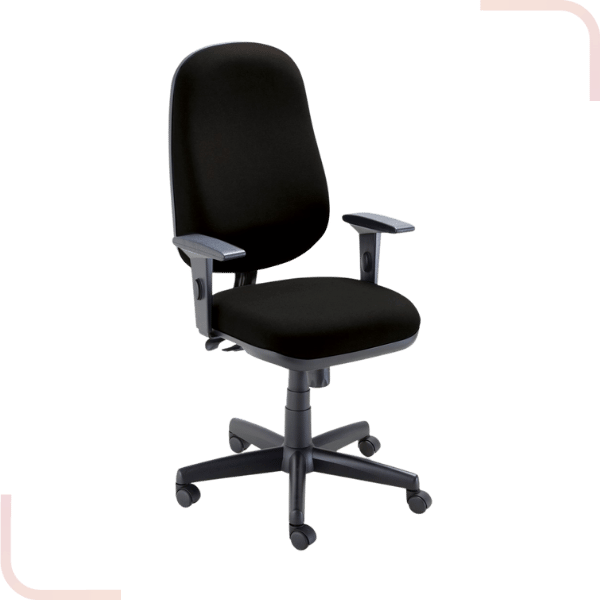 possui braços fixos ou reguláveis, mecanismo relax e ajuste de altura com pistão pneumático.