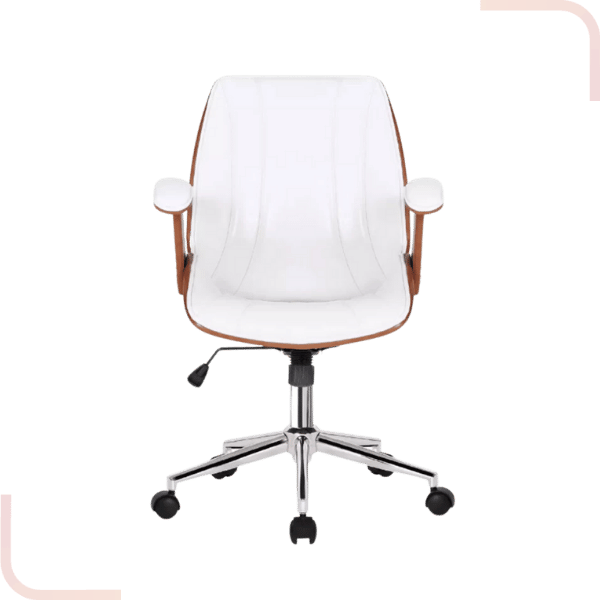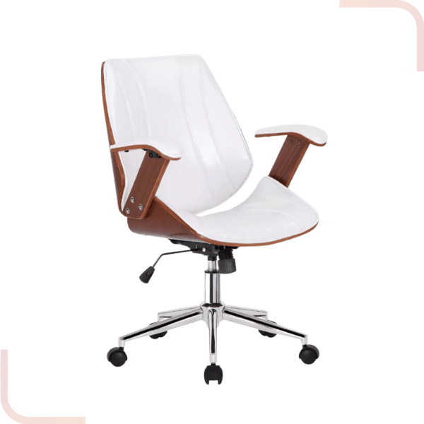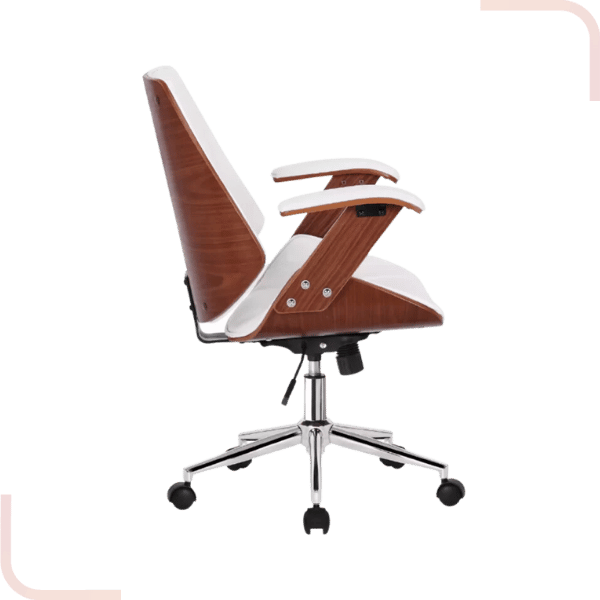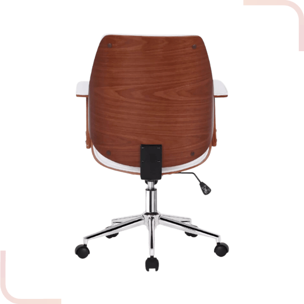 Sua estrutura em madeira multilaminada com base cromada e assento e encosto revestido em couro ecológico garantem durabilidade e um visual sofisticado.