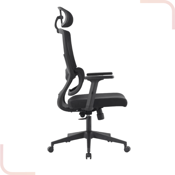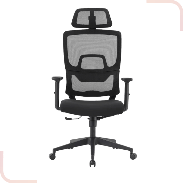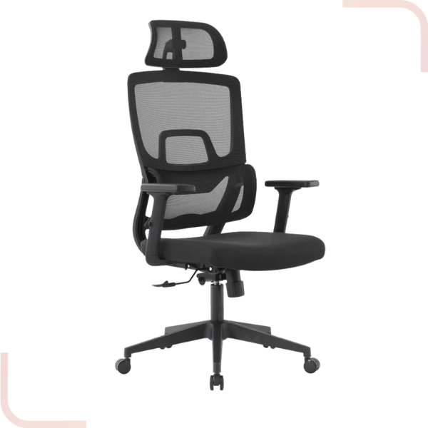 o encosto em tela garante ventilação e adaptação ao corpo, enquanto o encosto de cabeça ajustável proporciona suporte ideal para a cervical.