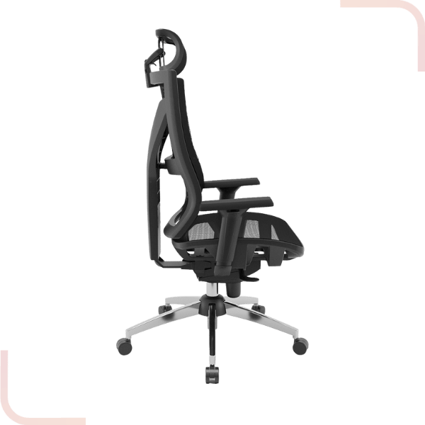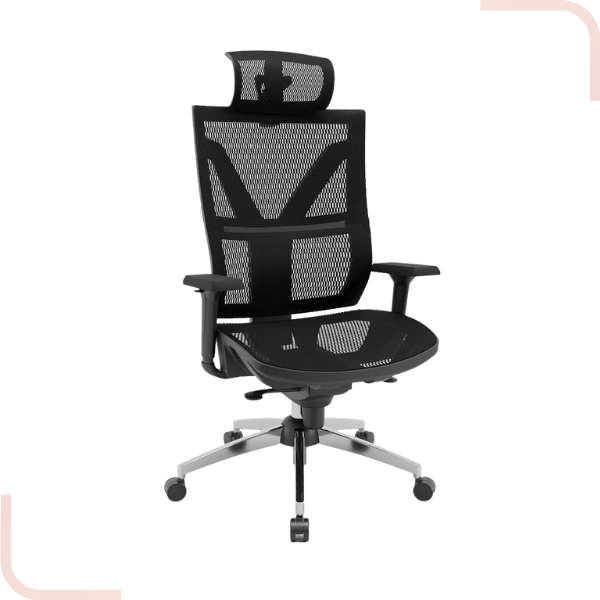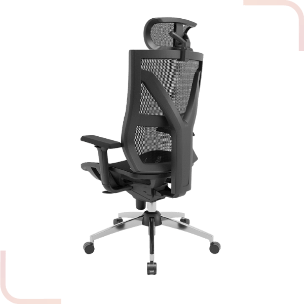 o encosto em tela garante ventilação e adaptação ao corpo, enquanto o encosto de cabeça ajustável proporciona suporte extra para a cervical.